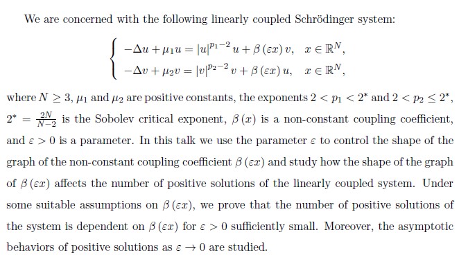 講 題:Multiplicity of positive solutions to linearly coupled Schrödinger systems involving critical exponent